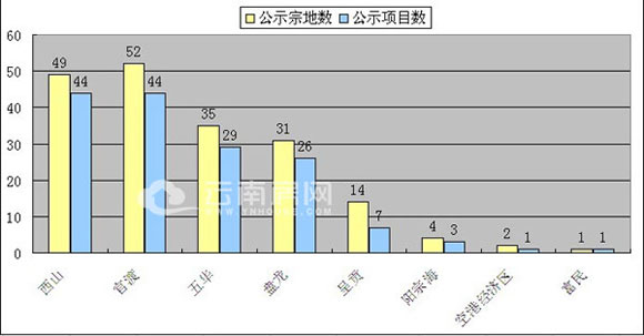 2012年1月—12月,昆明共計有188宗地塊,共150個項目獲得審批規劃公示。其中昆明官渡區以52宗地塊,44個項目為全年公示項目最多的片區。其次分別為,西山區共有49宗地塊,39個項目;五華區35宗地塊,29個項目;盤龍區31宗地塊,26個項目;呈貢新區14宗地塊,7個項目;陽宗海片區4宗地塊,3個項目;空港經濟區2宗地塊,1個項目;富民縣1宗地塊,1個項目,通過了規劃審批公示。