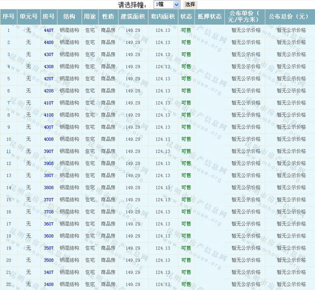 根據云南省物價局關于發布《云南省商品房銷售明碼標價實施細則(試行)》的通知,現將該項目商品住房的準售房源及每套房屋價格向社會公布,房地產開發企業應嚴格按照公布價格,商品房銷售明碼標價實行一套一標。商品房經營者應當對每套商品房按照建筑面具進行明碼標價,否則,房產登記機關不予登記備案。準售房源及房價信息如下:
