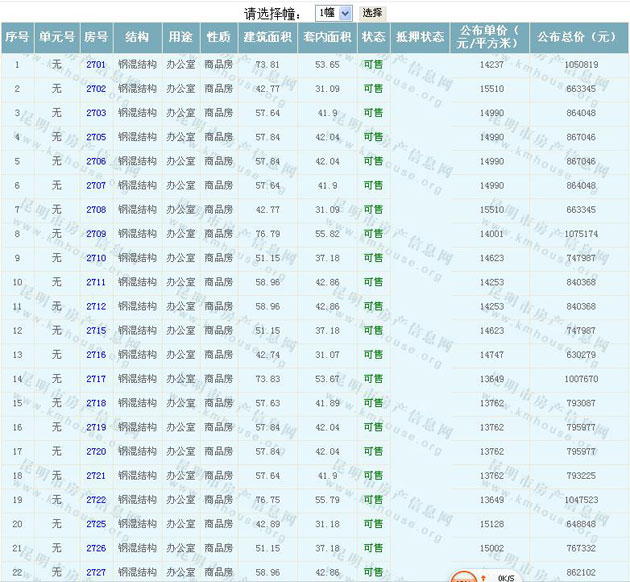 根據(jù)云南省物價(jià)局關(guān)于發(fā)布《云南省商品房銷售明碼標(biāo)價(jià)實(shí)施細(xì)則(試行)》的通知,現(xiàn)將該項(xiàng)目商品住房的準(zhǔn)售房源及每套房屋價(jià)格向社會(huì)公布,房地產(chǎn)開發(fā)企業(yè)應(yīng)嚴(yán)格按照公布價(jià)格,商品房銷售明碼標(biāo)價(jià)實(shí)行一套一標(biāo)。商品房經(jīng)營者應(yīng)當(dāng)對(duì)每套商品房按照建筑面具進(jìn)行明碼標(biāo)價(jià),否則,房產(chǎn)登記機(jī)關(guān)不予登記備案。準(zhǔn)售房源及房?jī)r(jià)信息如下: