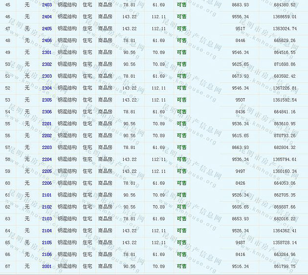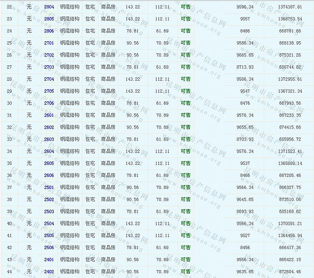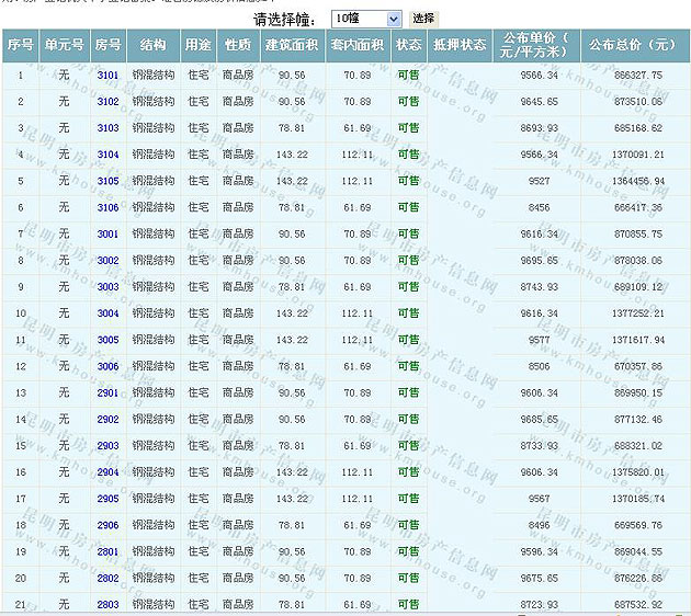 根據云南省物價局關于發布《云南省商品房銷售明碼標價實施細則(試行)》的通知,現將該項目商品住房的準售房源及每套房屋價格向社會公布,房地產開發企業應嚴格按照公布價格,商品房銷售明碼標價實行一套一標。商品房經營者應當對每套商品房按照建筑面具進行明碼標價,否則,房產登記機關不予登記備案。準售房源及房價信息如下: