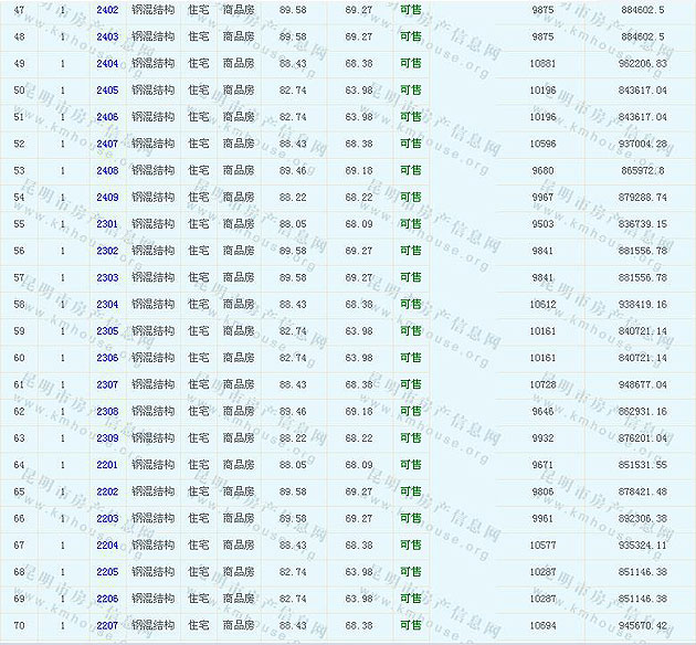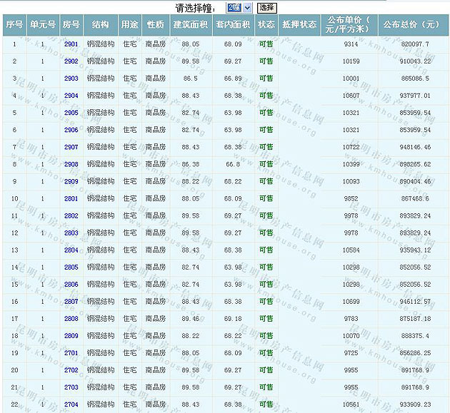 根據云南省物價局關于發布《云南省商品房銷售明碼標價實施細則(試行)》的通知,現將該項目商品住房的準售房源及每套房屋價格向社會公布,房地產開發企業應嚴格按照公布價格,商品房銷售明碼標價實行一套一標。商品房經營者應當對每套商品房按照建筑面具進行明碼標價,否則,房產登記機關不予登記備案。準售房源及房價信息如下: