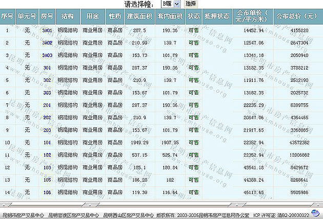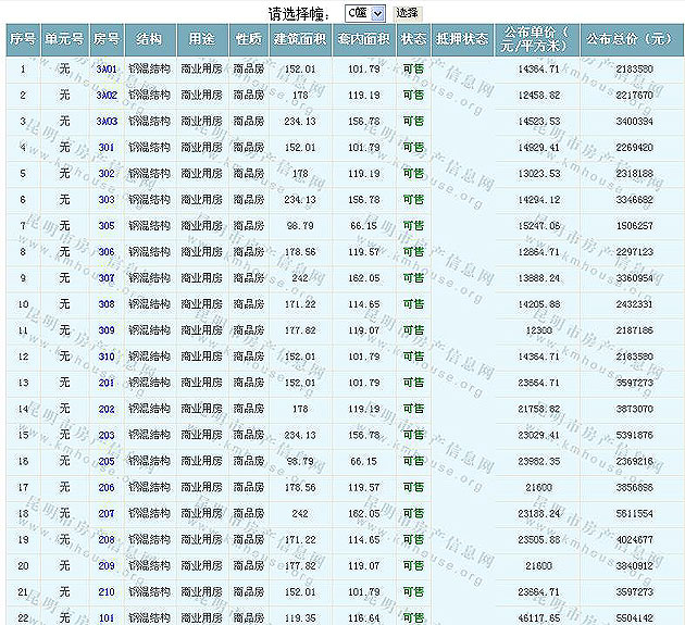 根據云南省物價局關于發布《云南省商品房銷售明碼標價實施細則(試行)》的通知,現將該項目商品住房的準售房源及每套房屋價格向社會公布,房地產開發企業應嚴格按照公布價格,商品房銷售明碼標價實行一套一標。商品房經營者應當對每套商品房按照建筑面具進行明碼標價,否則,房產登記機關不予登記備案。準售房源及房價信息如下: