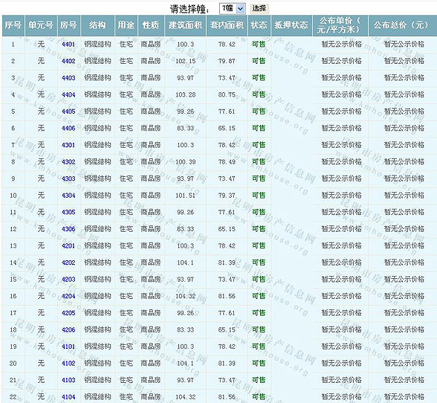 根據云南省物價局關于發布《云南省商品房銷售明碼標價實施細則(試行)》的通知,現將該項目商品住房的準售房源及每套房屋價格向社會公布,房地產開發企業應嚴格按照公布價格,商品房銷售明碼標價實行一套一標。商品房經營者應當對每套商品房按照建筑面具進行明碼標價,否則,房產登記機關不予登記備案。準售房源及房價信息如下: