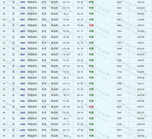 根據云南省物價局關于發布《云南省商品房銷售明碼標價實施細則(試行)》的通知,現將該項目商品住房的準售房源及每套房屋價格向社會公布,房地產開發企業應嚴格按照公布價格,商品房銷售明碼標價實行一套一標。商品房經營者應當對每套商品房按照建筑面具進行明碼標價,否則,房產登記機關不予登記備案。準售房源及房價信息如下: