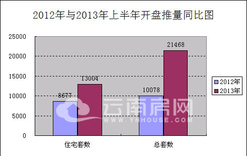 截止2013年6月30日,根據云南房網不完全統計的數據,1-6月,昆明主城區及呈貢共有60個項目開盤,推出各類物業共計21468套,與去年同期相比,在數量上同比增長113%。總體來看,住宅依然是眾多項目主推的物業類型,除去溫泉半島、銀海尚御、果林湖畔、鑫都韻城、銀河中央等5個項目在開盤時同時推出了住宅及其它的物業類型,其余25個項目在開盤當天僅推出了住宅。31個項目共推出住宅13004套,占據總物業數量的60%。其次,2013年上半年商業推盤量也較多,金尚俊園、昆明西山萬達廣場等25項目27次開盤,共推出商業(包括公寓、商鋪、寫字樓、酒店式公寓、產權酒店等物業類型)7846套。此外,滇池ONE、中航云璽大宅等6項目7次開盤,推出別墅625套。