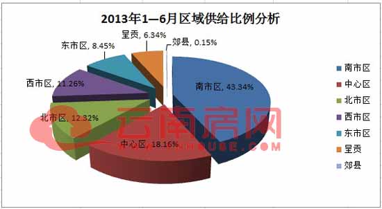 從獲得預售證的項目來看,昆明樓市上半年商品房主要供應集中在南市區,預售面積達到了2717621.65平米,占了2013年上半年總預售面積的近一半為43.34%;排名第二的是中心區,預售面積達1138694.03平米,占了2013年上半年總預售面積的18.16%;北市區與西市區平分秋色,預售面積分別為772399.83平米、705907.38平米,分別占了2013年上半年總預售面積的12.32%、11.26%;東市區今年上半年獲批預售面積為529957.75平米,占了2013年上半年總預售面積的8.45%;呈貢獲批預售面積達397346.06平米,占2013年上半年總預售面積的的6.34%;而郊縣最少,僅占今年上半年總預售面積的0.15%。