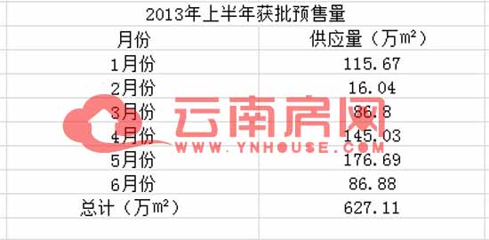 2013年上半年昆明預售證發放情況報告:62項目627萬方獲準售同比上漲19.78%