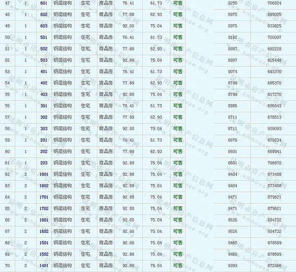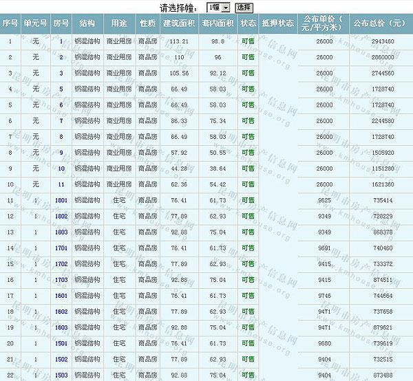 根據云南省物價局關于發布《云南省商品房銷售明碼標價實施細則(試行)》的通知,現將該項目商品住房的準售房源及每套房屋價格向社會公布,房地產開發企業應嚴格按照公布價格,商品房銷售明碼標價實行一套一標。商品房經營者應當對每套商品房按照建筑面具進行明碼標價,否則,房產登記機關不予登記備案。準售房源及房價信息如下: