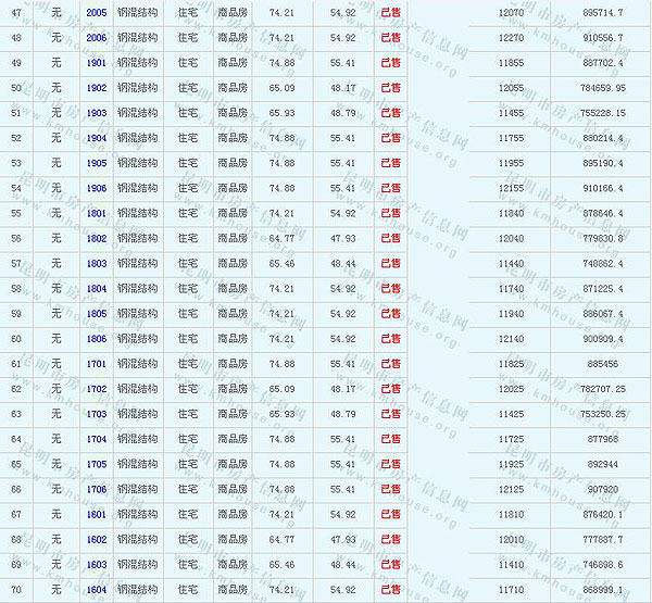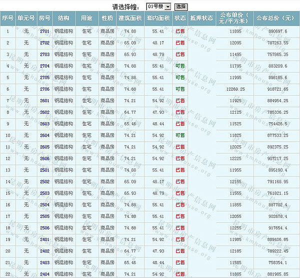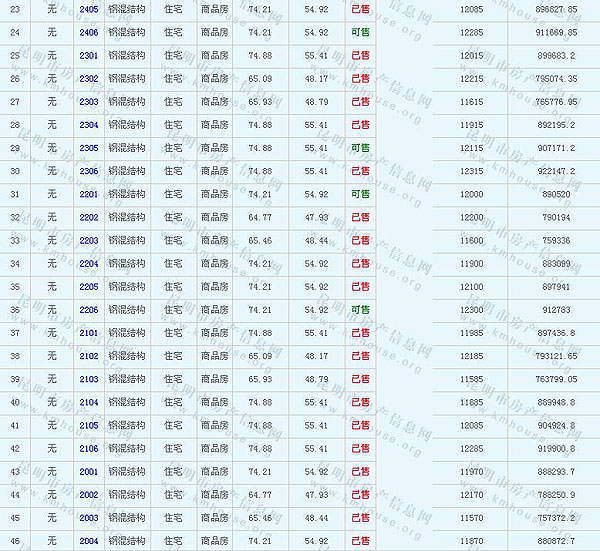 根據云南省物價局關于發布《云南省商品房銷售明碼標價實施細則(試行)》的通知,現將該項目商品住房的準售房源及每套房屋價格向社會公布,房地產開發企業應嚴格按照公布價格,商品房銷售明碼標價實行一套一標。商品房經營者應當對每套商品房按照建筑面具進行明碼標價,否則,房產登記機關不予登記備案。準售房源及房價信息如下: