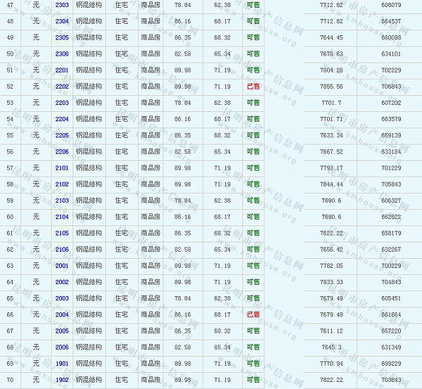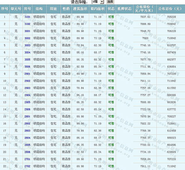 根據(jù)云南省物價局關于發(fā)布《云南省商品房銷售明碼標價實施細則(試行)》的通知,現(xiàn)將該項目商品住房的準售房源及每套房屋價格向社會公布,房地產開發(fā)企業(yè)應嚴格按照公布價格,商品房銷售明碼標價實行一套一標。商品房經營者應當對每套商品房按照建筑面具進行明碼標價,否則,房產登記機關不予登記備案。準售房源及房價信息如下:
