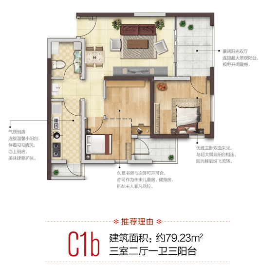 79.23㎡的戶型,三室兩廳三陽臺精巧空間。獨特三陽臺設計,美景、陽光、清風、星辰一并輕盈入室,與自然的距離更進一步。三房設計舒適實用,私密性強,滿足兩口、三口之家的全面需求;主臥雙面采光,與超大景觀陽臺相連,陽光鮮氧紛飛流轉;書房與次臥可開可合,亦可作為未來兒童房、健身房;廚房連接溫馨小陽臺。三梯六戶設計,得享均好景觀、整潔環境、陽光鄰里,生活精彩四溢。