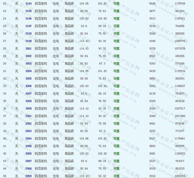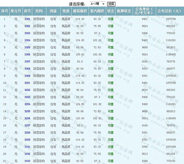 根據云南省物價局關于發布《云南省商品房銷售明碼標價實施細則(試行)》的通知,現將該項目商品住房的準售房源及每套房屋價格向社會公布,房地產開發企業應嚴格按照公布價格,商品房銷售明碼標價實行一套一標。商品房經營者應當對每套商品房按照建筑面具進行明碼標價,否則,房產登記機關不予登記備案。準售房源及房價信息如下: