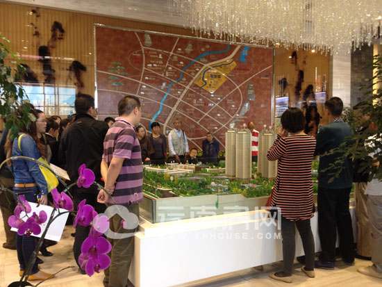 進入營銷中心時,才發現這里的熱鬧與外面大馬路上的冷清形成了鮮明的對比,許多購房者或圍在沙盤前詳細了解項目信息,或在洽談區研究戶型。而不少填完認籌表格的購房者正在排隊辦理相關手續。置業顧問也忙得腳不沾地,穿梭于不同客戶之間。