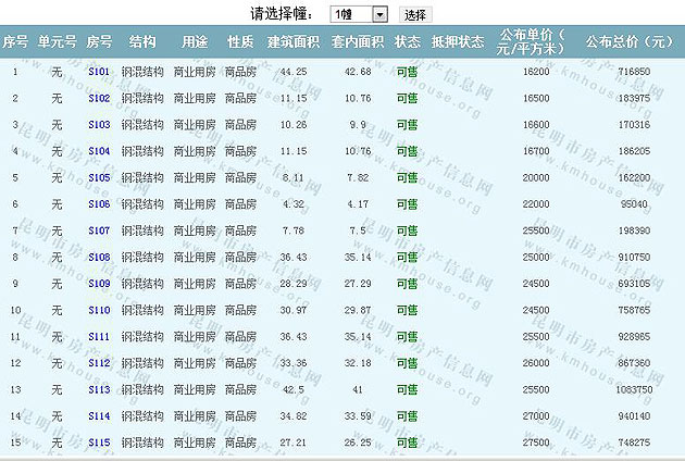 根據云南省物價局關于發布《云南省商品房銷售明碼標價實施細則(試行)》的通知,現將該項目商品住房的準售房源及每套房屋價格向社會公布,房地產開發企業應嚴格按照公布價格,商品房銷售明碼標價實行一套一標。商品房經營者應當對每套商品房按照建筑面具進行明碼標價,否則,房產登記機關不予登記備案。準售房源及房價信息如下: