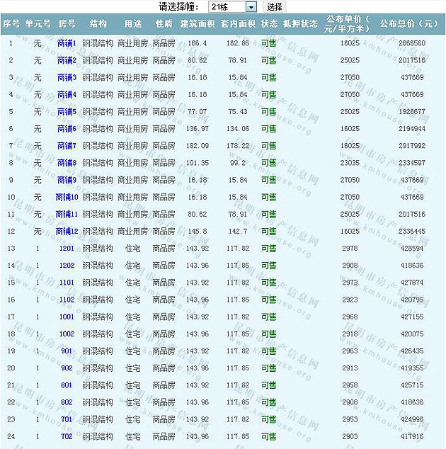 根據(jù)云南省物價(jià)局關(guān)于發(fā)布《云南省商品房銷售明碼標(biāo)價(jià)實(shí)施細(xì)則(試行)》的通知,現(xiàn)將該項(xiàng)目商品住房的準(zhǔn)售房源及每套房屋價(jià)格向社會(huì)公布,房地產(chǎn)開發(fā)企業(yè)應(yīng)嚴(yán)格按照公布價(jià)格,商品房銷售明碼標(biāo)價(jià)實(shí)行一套一標(biāo)。商品房經(jīng)營者應(yīng)當(dāng)對(duì)每套商品房按照建筑面具進(jìn)行明碼標(biāo)價(jià),否則,房產(chǎn)登記機(jī)關(guān)不予登記備案。準(zhǔn)售房源及房價(jià)信息如下: