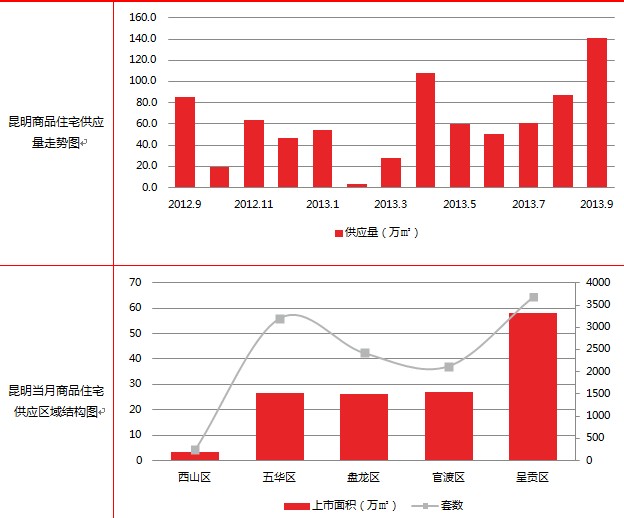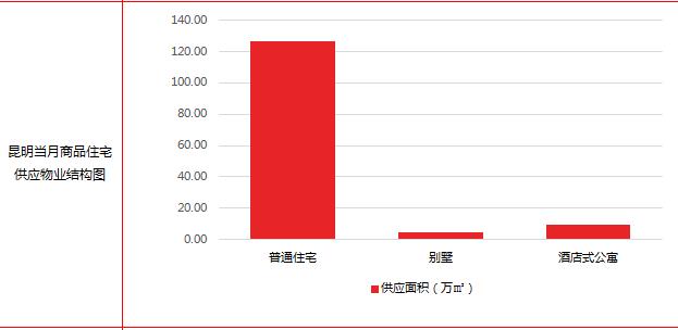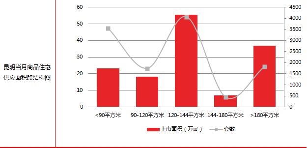 9月商品住宅市場供應大幅增加,人民路壹號、盛唐城、西城時代、水電金檀、海倫國際、萬科魅力之城、金尚俊園相繼開盤,商品住宅市場新增供應量為140.88萬㎡,環比8月增加了53.76萬㎡,上升了61.71%。整體來看,本月新入市項目的物業類型以改善型產品為主,主要分布在昆明市盤龍區和官渡區,以120-144㎡的戶型為主。