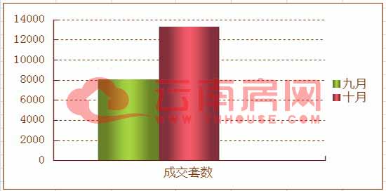 成交方面,2013年10月,根據昆明市房產信息網統計數據顯示,從2013年10月1日至2013年10月31日一個月內,1日-7日成交數據缺失,其余24天昆明主城區及呈貢新城共成交各類商品房13300套,比2013年9月8057套增加了5243套,環比上漲了65.07%;2013年10月份,昆明商品房成交總面積為1012881.62㎡,比2013年9月份690875.53㎡增加了322006.09㎡,環比上漲了46.6%。