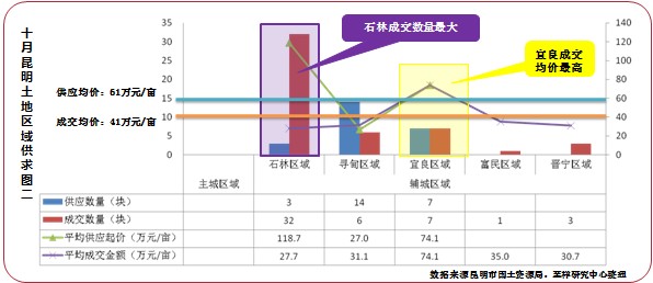 10月份昆明主城區(qū)域無土地供應(yīng)和成交;輔城宜良區(qū)域土地供應(yīng)較多,石林區(qū)域成交較大;