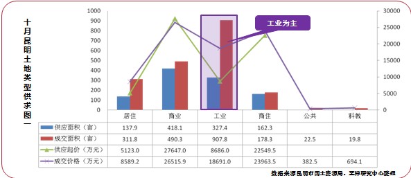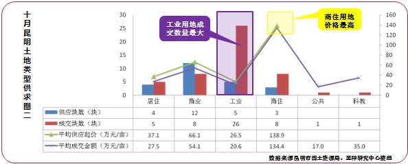10月昆明土地供應居住用地4塊、商業用地12塊、工業用地5塊,商住用地3塊;土地成交居住用地5塊、商業用地8塊、工業用地26塊、公共用地1塊、科教用地1塊、商住用地8塊;