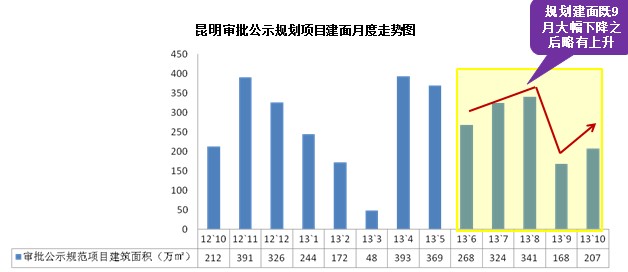 10月昆明審批公示規范項目建筑面積207萬㎡,與去年同期相比,規劃建筑面積減少僅5萬㎡,與今年1-9月相比,昆明審批公示規范項目建筑面積僅次于2月、3月和9月。