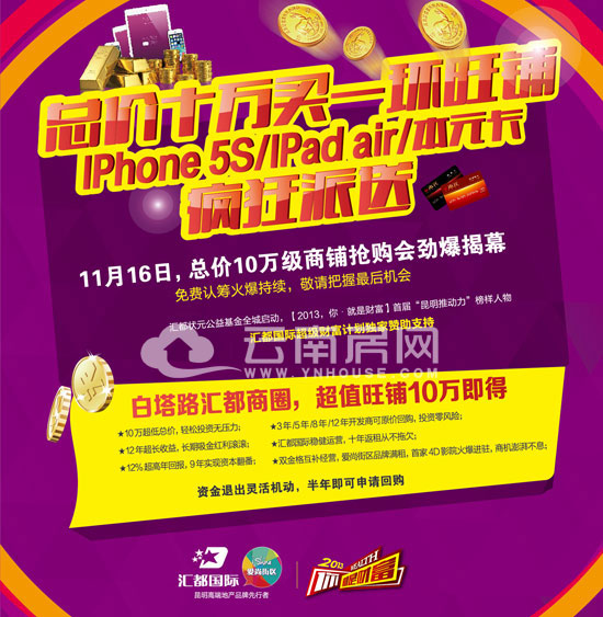 在昆明,動輒幾百萬、上千萬的商鋪比比皆是,商鋪的高總價、高投入成為了最大的投資障礙,讓很多小投資客望而卻步。誰能相信總價10萬就能買鋪,而且還是一環白塔路的黃金旺鋪!11月16日,匯都國際總價10萬商鋪搶購會勁爆揭幕!當天搶購更有iphone5S/ipadair/本元卡等驚喜大禮瘋狂大派送!