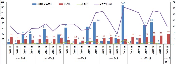 本周市場新增供應2.58萬方,成交面積39.13萬方,批售比為0.07。