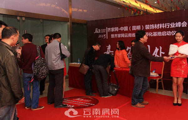 11月13日下午13時50分,當云南房網小編來到位于昆明市北市區的和諧世紀商城負一樓活動大廳時,受邀的嘉賓、商家、客戶及各家媒體已經等以陸續簽到并就坐,同時享用著主辦方準備好的水果、甜點等冷餐。出席此次活動的齊家網副總裁毛新勇、齊家網昆明站總經理鄧富龍、昆明市建筑裝材料行業協會鄭斌、昆明市裝飾材料行業協會秘書長李江等相關部門領導。