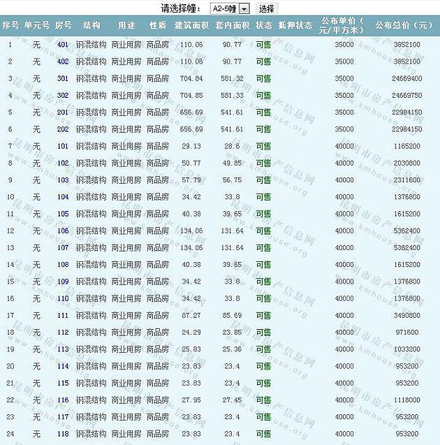 根據(jù)云南省物價(jià)局關(guān)于發(fā)布《云南省商品房銷售明碼標(biāo)價(jià)實(shí)施細(xì)則(試行)》的通知,現(xiàn)將該項(xiàng)目商品住房的準(zhǔn)售房源及每套房屋價(jià)格向社會(huì)公布,房地產(chǎn)開發(fā)企業(yè)應(yīng)嚴(yán)格按照公布價(jià)格,商品房銷售明碼標(biāo)價(jià)實(shí)行一套一標(biāo)。商品房經(jīng)營者應(yīng)當(dāng)對(duì)每套商品房按照建筑面具進(jìn)行明碼標(biāo)價(jià),否則,房產(chǎn)登記機(jī)關(guān)不予登記備案。準(zhǔn)售房源及房?jī)r(jià)信息如下: