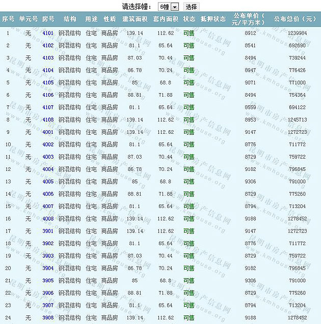 根據云南省物價局關于發布《云南省商品房銷售明碼標價實施細則(試行)》的通知,現將該項目商品住房的準售房源及每套房屋價格向社會公布,房地產開發企業應嚴格按照公布價格,商品房銷售明碼標價實行一套一標。商品房經營者應當對每套商品房按照建筑面具進行明碼標價,否則,房產登記機關不予登記備案。準售房源及房價信息如下: