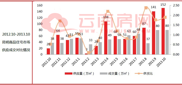 10月,昆明商品房市場新增供應面積169.47萬平米,環(huán)比下降2.77%;成交面積101.3萬平米,環(huán)比增加37.1%,供求比為1.67。受近段時間政策層面?zhèn)鞒龅囊恍┦站o信號以及不少停貸或提高利率的報道所影響。由于供應量持續(xù)走高,成交量的增長并未打破供大于求的態(tài)勢,商品房庫存量仍處高位。受持續(xù)推盤幅度增加的影響,一定程度上會加大未來樓市成交繼續(xù)上升的預期走勢。(文章圖片來源于克而瑞信息集團)