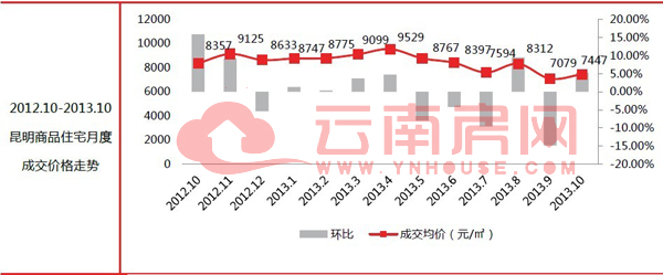 2013年10月,昆明商品住宅成交均價為7447元/㎡,同比上漲5.2%,環(huán)比下降11%。10月是今年以來住宅成交價格第二低的月份,最低的是9月份,由于天宇瀾山大量入市,拉低了月度的商品住宅成交價格。10月份,天宇瀾山銷售面積依然最高,加上呈貢金盾俊園、區(qū)長水航城等項目大量成交,拉低了本月的住宅成交均價。