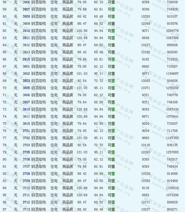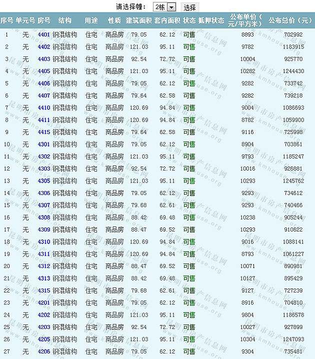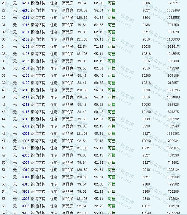 根據云南省物價局關于發(fā)布《云南省商品房銷售明碼標價實施細則(試行)》的通知,現(xiàn)將該項目商品住房的準售房源及每套房屋價格向社會公布,房地產開發(fā)企業(yè)應嚴格按照公布價格,商品房銷售明碼標價實行一套一標。商品房經營者應當對每套商品房按照建筑面具進行明碼標價,否則,房產登記機關不予登記備案。準售房源及房價信息如下: