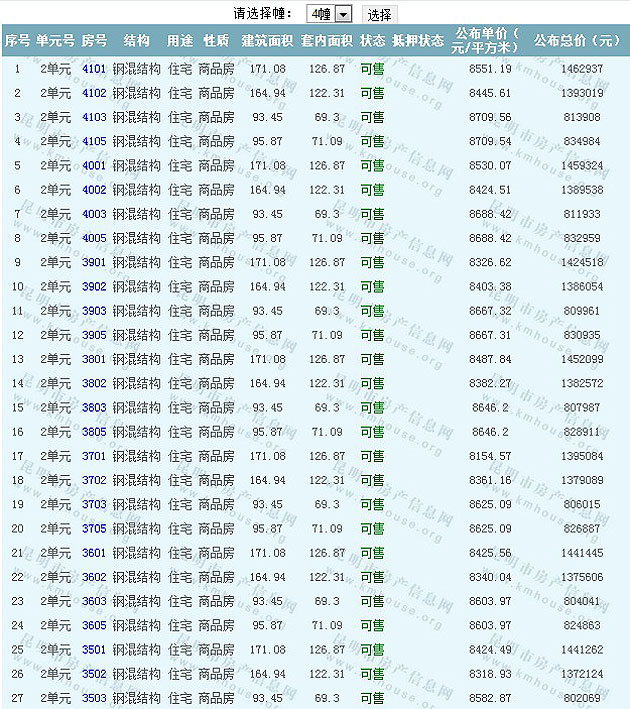 根據云南省物價局關于發布《云南省商品房銷售明碼標價實施細則(試行)》的通知,現將該項目商品住房的準售房源及每套房屋價格向社會公布,房地產開發企業應嚴格按照公布價格,商品房銷售明碼標價實行一套一標。商品房經營者應當對每套商品房按照建筑面具進行明碼標價,否則,房產登記機關不予登記備案。準售房源及房價信息如下: