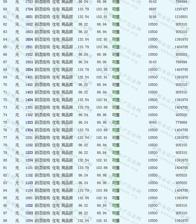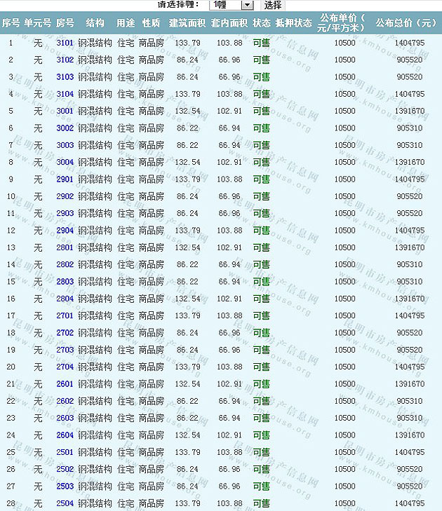 根據(jù)云南省物價局關(guān)于發(fā)布《云南省商品房銷售明碼標(biāo)價實(shí)施細(xì)則(試行)》的通知,現(xiàn)將該項(xiàng)目商品住房的準(zhǔn)售房源及每套房屋價格向社會公布,房地產(chǎn)開發(fā)企業(yè)應(yīng)嚴(yán)格按照公布價格,商品房銷售明碼標(biāo)價實(shí)行一套一標(biāo)。商品房經(jīng)營者應(yīng)當(dāng)對每套商品房按照建筑面具進(jìn)行明碼標(biāo)價,否則,房產(chǎn)登記機(jī)關(guān)不予登記備案。準(zhǔn)售房源及房價信息如下: