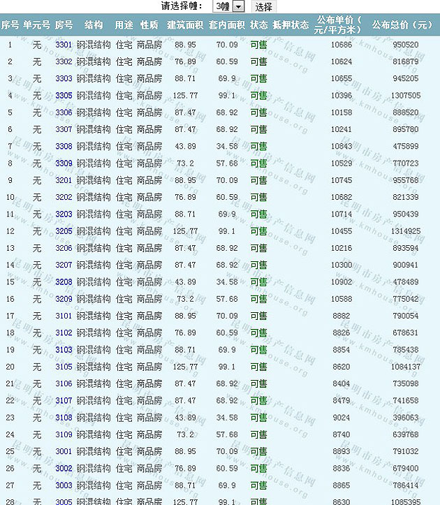 根據(jù)云南省物價(jià)局關(guān)于發(fā)布《云南省商品房銷售明碼標(biāo)價(jià)實(shí)施細(xì)則(試行)》的通知,現(xiàn)將該項(xiàng)目商品住房的準(zhǔn)售房源及每套房屋價(jià)格向社會公布,房地產(chǎn)開發(fā)企業(yè)應(yīng)嚴(yán)格按照公布價(jià)格,商品房銷售明碼標(biāo)價(jià)實(shí)行一套一標(biāo)。商品房經(jīng)營者應(yīng)當(dāng)對每套商品房按照建筑面具進(jìn)行明碼標(biāo)價(jià),否則,房產(chǎn)登記機(jī)關(guān)不予登記備案。準(zhǔn)售房源及房價(jià)信息如下: