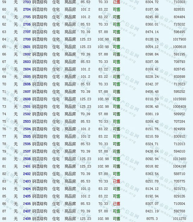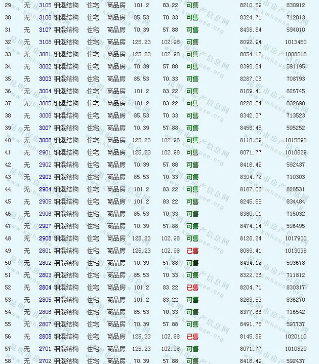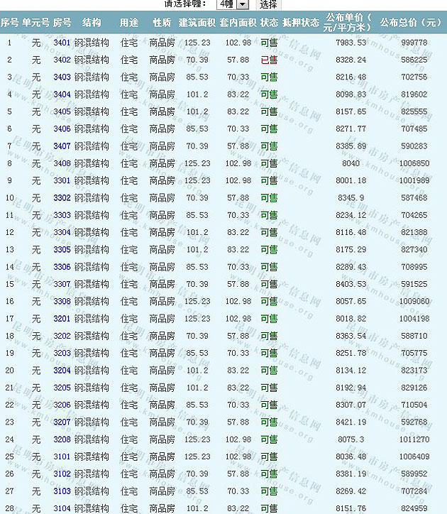 根據云南省物價局關于發布《云南省商品房銷售明碼標價實施細則(試行)》的通知,現將該項目商品住房的準售房源及每套房屋價格向社會公布,房地產開發企業應嚴格按照公布價格,商品房銷售明碼標價實行一套一標。商品房經營者應當對每套商品房按照建筑面具進行明碼標價,否則,房產登記機關不予登記備案。準售房源及房價信息如下:
