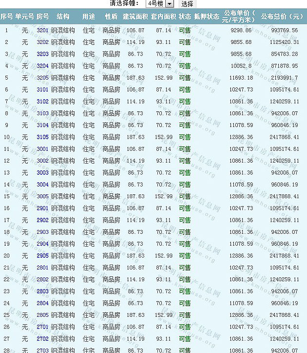 根據(jù)云南省物價局關于發(fā)布《云南省商品房銷售明碼標價實施細則(試行)》的通知,現(xiàn)將該項目商品住房的準售房源及每套房屋價格向社會公布,房地產(chǎn)開發(fā)企業(yè)應嚴格按照公布價格,商品房銷售明碼標價實行一套一標。商品房經(jīng)營者應當對每套商品房按照建筑面具進行明碼標價,否則,房產(chǎn)登記機關不予登記備案。準售房源及房價信息如下: