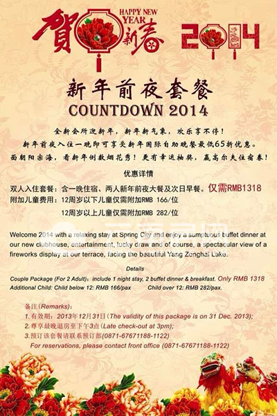 為迎接2014年新年到來,位于陽宗海度假片區(qū)的春城湖畔度假村,特推出,新年前夜(12月31日),雙人入住項目內的五星級度假酒店一晚,即可享受新年國際自助晚餐,最低可享6.5折優(yōu)惠;面朝陽宗海,觀看新年倒數煙花秀;參加幸運抽獎,贏高爾夫住宿。雙人入住價格1318元。雙人入住套餐含一晚住宿、兩人新年前夜大餐及次日早餐。