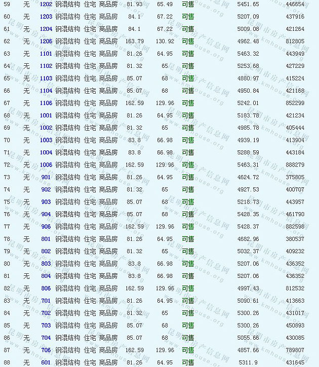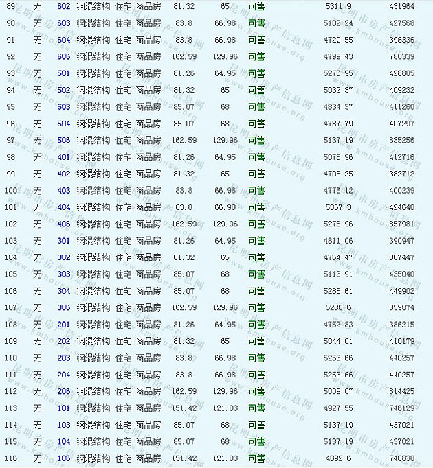 根據云南省物價局關于發布《云南省商品房銷售明碼標價實施細則(試行)》的通知,現將該項目商品住房的準售房源及每套房屋價格向社會公布,房地產開發企業應嚴格按照公布價格,商品房銷售明碼標價實行一套一標。商品房經營者應當對每套商品房按照建筑面具進行明碼標價,否則,房產登記機關不予登記備案。準售房源及房價信息如下: