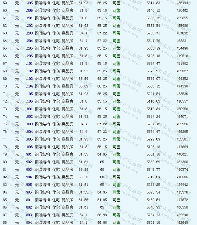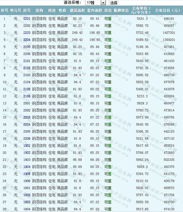 根據云南省物價局關于發布《云南省商品房銷售明碼標價實施細則(試行)》的通知,現將該項目商品住房的準售房源及每套房屋價格向社會公布,房地產開發企業應嚴格按照公布價格,商品房銷售明碼標價實行一套一標。商品房經營者應當對每套商品房按照建筑面具進行明碼標價,否則,房產登記機關不予登記備案。準售房源及房價信息如下: