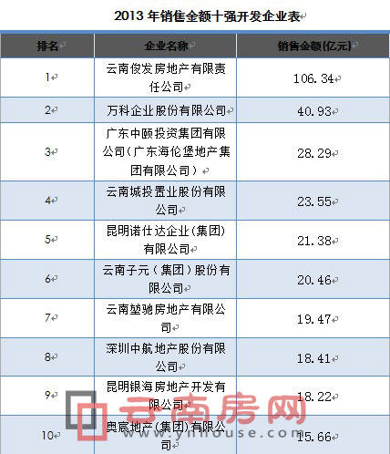 據(jù)克而瑞發(fā)布的數(shù)據(jù),2013年,云南俊發(fā)房地產(chǎn)有限責(zé)任公司以106.34億元的銷售成績據(jù)昆明銷售金額十強(qiáng)開發(fā)企業(yè)之首,而昆明萬科則以40.93億的成績退居第二,海倫堡憑借其海倫國際在市場(chǎng)上一貫的好評(píng)度而博得28.29億元的銷售成績。云南城投、諾仕達(dá)、云南子元、昆明諾仕達(dá)、云南堃馳、深圳中航、昆明銀海、奧宸地產(chǎn)等榜上有名。