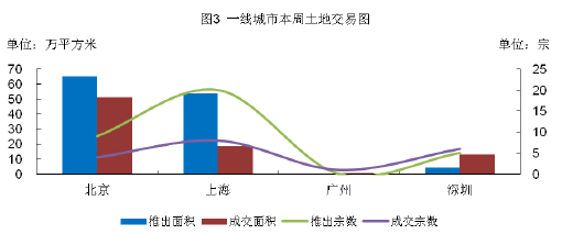 一線城市北京、上海和深圳有地塊推出,推出量與上周持平。本周一線城市共推出土地34宗,較上周增加9宗,推出土地面積123萬平方米,與上周持平。北京和上海有住宅用地推出,共計8宗,合計55萬平方米。