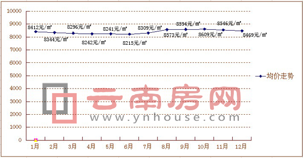 1月份昆明新建商品房住宅均價為8412元/平米,價格中位數為8500元/平米,環比2012年12月住宅均價下跌1.2%。隨后5個月里,每個月以不足1%的跌幅連續下跌,到了6月份住宅均價為8215元/平米,與年初8412元/平米相比,下跌了197元/平米。7月份開始到10月份,住宅均價連續上漲,其中8月份環比漲幅最大,為3.18%,當月住宅均價為8573元/平米,但價格中位數與7月份一樣,都為8500元/平米;到了10月份,住宅均價達全年最高值,為8609元/平米,此后兩個月價格環比連續下跌。