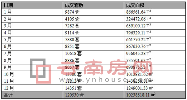 根據昆明市房產信息網統計數據顯示,從2013年01月01日至2013年12月31日,一年內昆明主城區及呈貢新城共成交各類商品房120530套,較2012年的80455套增加了40075套,同比上漲了49.81%;成交面積方面,2013年昆明樓市成交商品房總面積為10238518.11㎡,較2012年的6939931.5㎡增加了3298586.61㎡,同比上漲了47.53%。