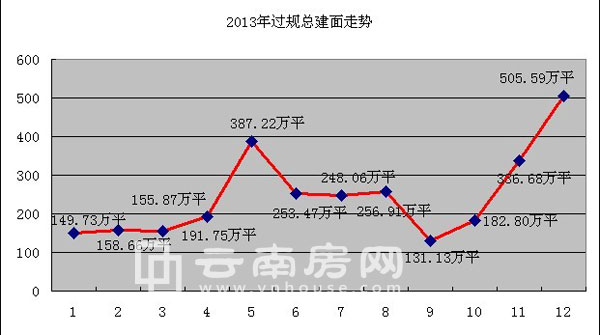 2013年昆明過規土地呈中間高并在下半年逐漸走高的走勢,其中5月、11月、12月過規總建面均超過300萬方。具體為:1月共計20宗土地,18個項目,106.3179518萬平米凈用地面積,149.731858萬平米總建筑面積過規;2月,10宗土地,10個項目,43.882514萬平米凈用地面積,158.663808萬平米總建筑面積過規;3月,4宗土地,4個項目,30.241706萬平米凈用地面積,155.867646萬平米總建筑面積過規;4月,8宗土地,7個項目,33.70655萬平米凈用地面積,191.7497827萬平米總建筑面積過規;5月,15宗土地,14個項目,66.9494404萬平米凈用地面積,387.2201242萬平米總建筑面積過規;6月,16宗土地,12個項目,77.620709萬平米凈用地面積,253.473166萬平米總建筑面積過規;7月,23宗土地,18個項目,76.784186萬平米凈用地面積,248.056361萬平米總建筑面積過規;8月,16宗土地,11個項目,82.872601萬平米凈用地面積,265.908745萬平米總建筑面積過規;9月,13宗土地,13個項目,22.395782萬平米凈用地面積,131.129994萬平米總建筑面積過規;10月,8宗土地,8個項目,47.843325萬平米凈用地面積,182.801203萬平米總建筑面積過規;11月,22宗土地,17個項目,243.695443萬平米凈用地面積,336.675248萬平米總建筑面積過規;12月,24宗土地,19個項目,97.546291萬平米凈用地面積,505.594518萬平米總建筑面積過規。