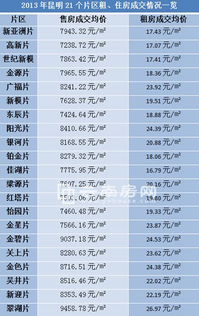 2013年昆明21個片區(qū)租、住房成交情況一覽