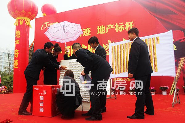 此次項目開盤采用公開搖號方式進行。在開發商為客戶提供的雨傘撐起來的一片“五彩小世界”里,主持人不斷叫出由順序客戶抽取出的號碼,已被抽出的客戶即可排隊進入售樓部選房區選房。