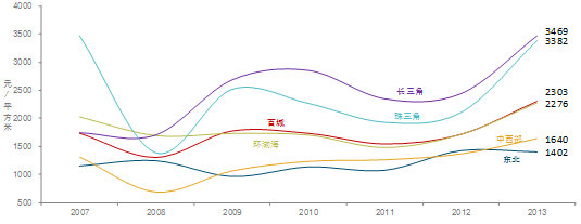 各區(qū)域樓面均價同比均為上漲,珠三角地區(qū)樓面均價及同、環(huán)比漲幅均居五大區(qū)域首位。2013年四季度珠三角地區(qū)住宅用地樓面均價為3975元/平方米,為2012年三季度以來首次超過長三角地區(qū),位居五大區(qū)域之首,同、環(huán)比分別大幅上漲62.6%和30.7%,漲幅均為五大區(qū)域最高,廈門是該區(qū)域地價最高的城市,樓面均價為13831元/平方米,同比大幅上漲441.1%;長三角地區(qū)樓面均價為3329元/平方米,排名第二位,同比上漲1.3%,為各區(qū)域中最小漲幅,該區(qū)域地價最高城市為南京,達11976元/平方米,同比上漲134.3%;環(huán)渤海地區(qū)為2568元/平方米,略高于百城平均水平(2495元/平方米),同環(huán)比分別上漲53.9%、1.1%,其中北京住宅用地樓面均價為9523元/平方米,在該區(qū)域價格最高,同比上漲71.2%;中西部地區(qū)樓面均價為1678元/平方米,環(huán)比下降19.1%,降幅最大,其中贛州樓面均價最高,為2787元/平方米;東北部地區(qū)樓面均價為1617元/平方米,為五大區(qū)域最低,同比上漲2.2%,其中沈陽樓面均價最高,為2118元/平方米。長三角、珠三角和環(huán)渤海地區(qū)樓面均價高于百城平均水平,東北、中西部地區(qū)均低于百城平均水平。價格最高的珠三角地區(qū)和最低的東北地區(qū)差距縮小至2357元/平方米。