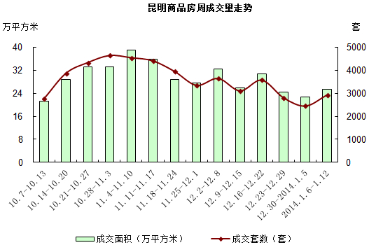 商品房成交量開始上揚。本周(1.6-1.12)昆明樓市成交在連續兩個月下滑后開始上揚,共成交商品房25.43萬平方米,環比上漲11.53%;商品房成交套數為2929套,較上周增加475套,環比增長19.36%;本周昆明商品房套均成交面積為86.83平方米,較上周每套減少6.10平方米。