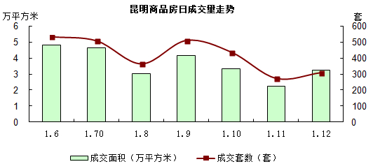 本周(1.6-1.12)昆明樓市成交在連續兩個月下滑后開始上揚,共成交商品房25.43萬平方米,環比上漲11.53%;商品房成交套數為2929套,較上周增加475套,環比增長19.36%;本周昆明商品房套均成交面積為86.83平方米,較上周每套減少6.10平方米。